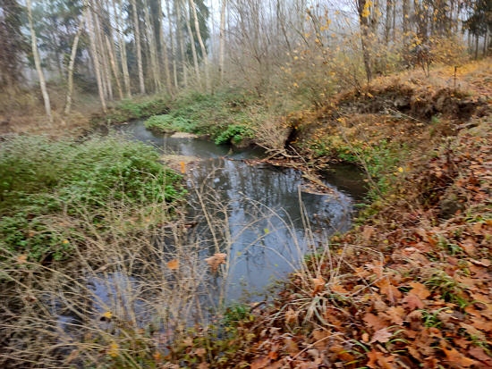 Bei Hirbishofen erreichten wir wieder eine feste Straße und eine weitere Brücke. Kurz dahinter erreichten wir endlich den Wald, was aber bedeutete, dass wir auf festen Wegen laufen mussten, denn im Wald ist das Ufer der Bäche durch Bewuchs mit Bäumen und Sträuchern unzugänglich. Gemäß unseren Regeln gerieten wir aber selten außer Sichtweite des Baches.