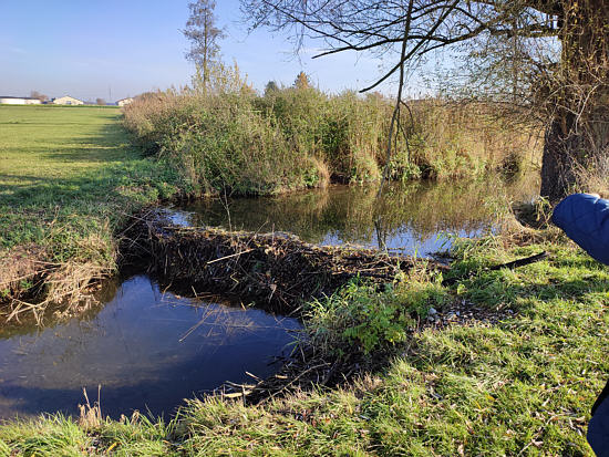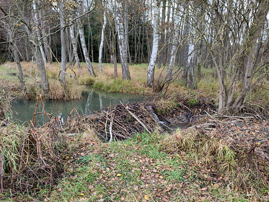 Steinheim selbst betraten wir nicht. Aber am Ortsausgang erreichten wir unsere Leibi wieder. Einer von uns, Beate, fiel auf, dass es zwar keinen Uferweg gab, aber einen Pfad, der direkt am Ufer entlangführte. Jetzt im Winter machte es keine Mühe, auf dem Grasweg zu gehen, dafür war die Natur umso beeindruckender. Überall majestätische Weiden, kahle Sträucher voller prallroter Beeren. Vor allem aber Biberspuren. Hier ein Weg ins Feld, dort zwanzig angeknabberte Bäume, und immer wieder Biberburgen, die den Bach in regelmäßigen Abständen immer wieder aufstauten.